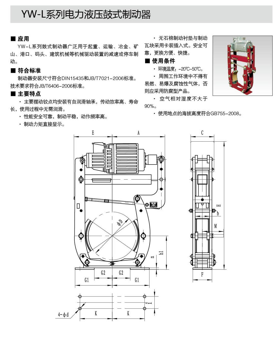 YW-L系列制动器连接尺寸及制动力矩参数符合JB/T6406-2006标准和DIN15435标准。配套符合DIN15430标准的Ed系列推动器。