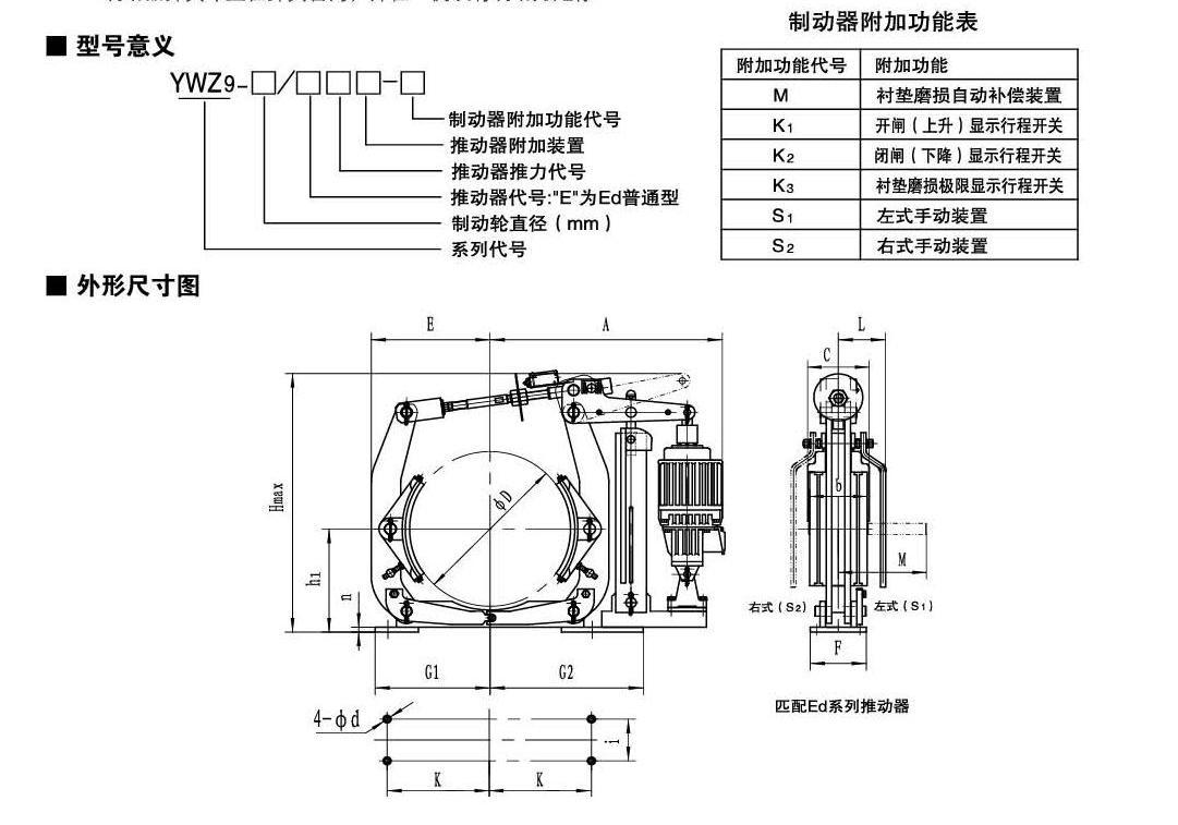 YWZ5系列电力液压鼓式制动器的连接尺寸和制动力矩参数符合GB6333-86标准,技术要求符合JB / T6406-2006标准,配套符合DIN15430标准的Ed系列推动器。