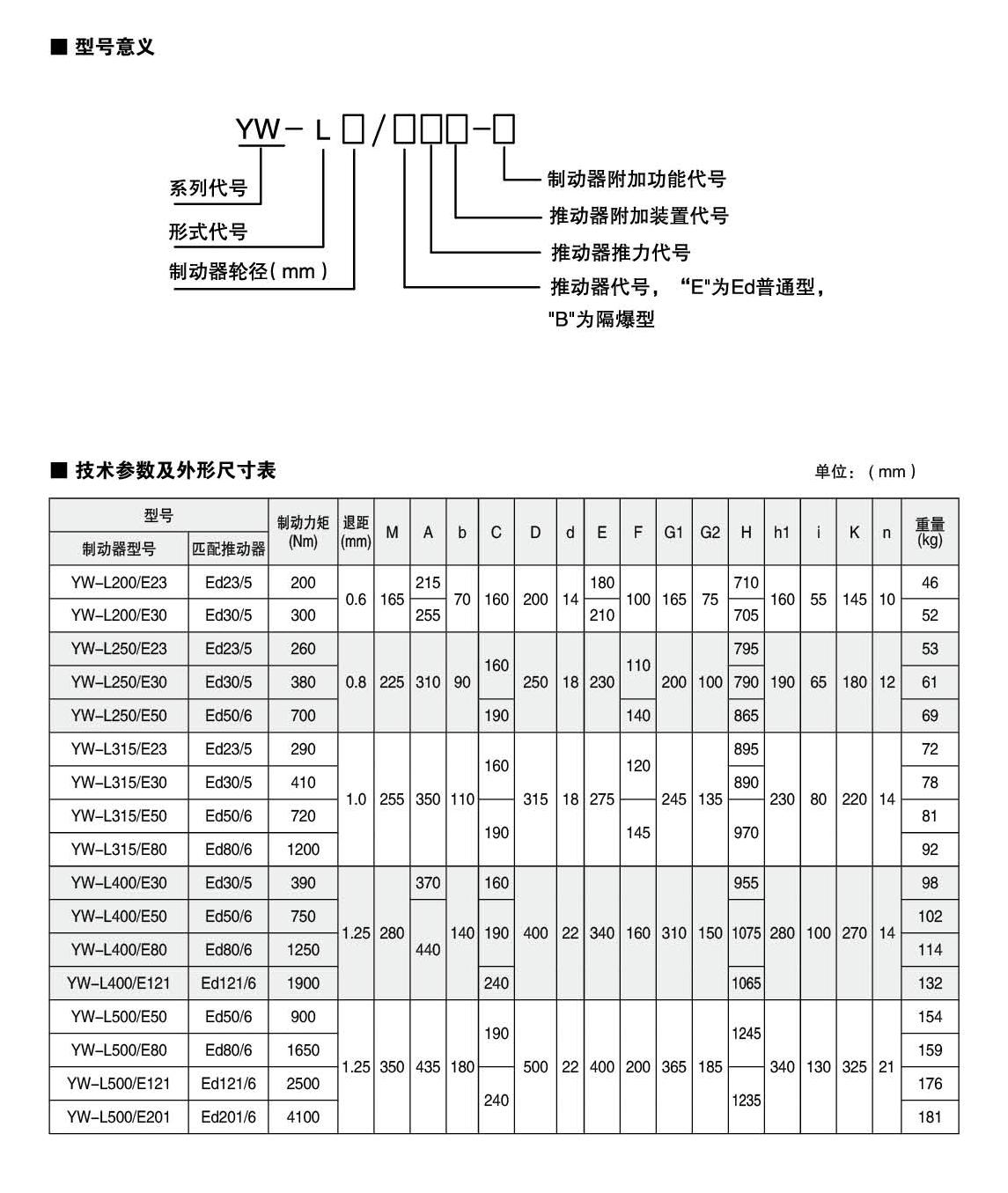 YW-L系列制动器连接尺寸及制动力矩参数符合JB/T6406-2006标准和DIN15435标准。配套符合DIN15430标准的Ed系列推动器。