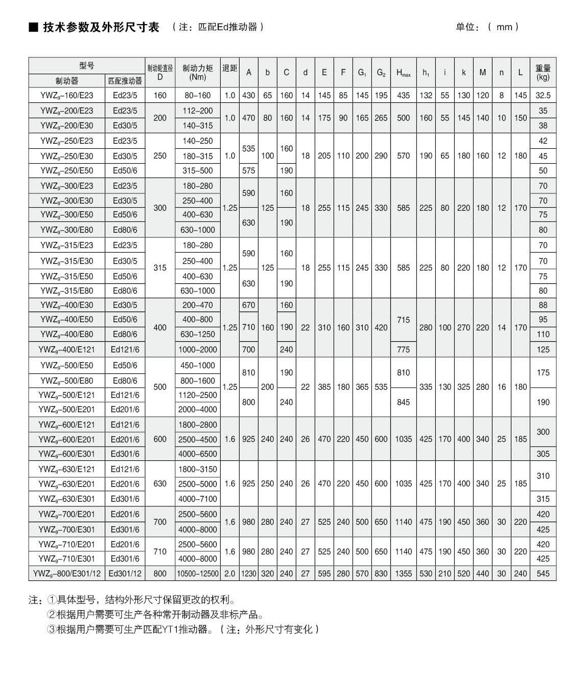 YWZ5系列电力液压鼓式制动器的连接尺寸和制动力矩参数符合GB6333-86标准,技术要求符合JB / T6406-2006标准,配套符合DIN15430标准的Ed系列推动器。